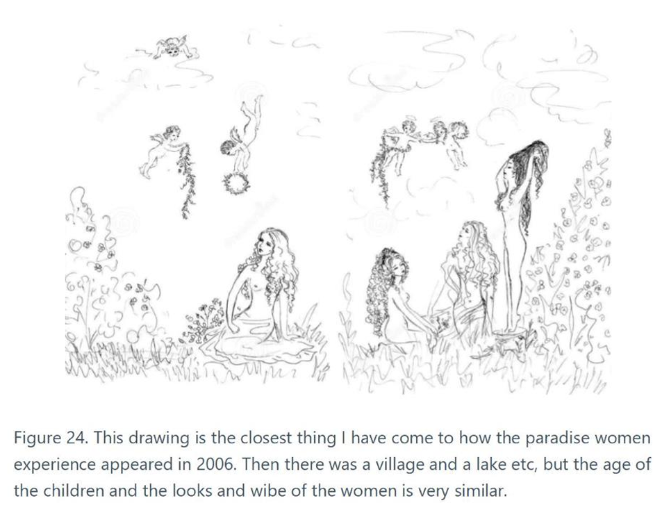 At this point I was probably still lying in bed with my eyes closed. I saw maybe 100 other women surrounded by small children and babies in this small village, but not more than a 100. Those 5 or 6 women from my room who flew around me showed and explained to me what their paradise was like and that they belonged to a higher form of life, where death or fear did not exist. So they also belonged to this place, so I guess it wasn’t necessary for them to be surrounded by children all the time. The whole time, the attention was focused on producing love and a constant sense of security that constantly lifted us up into the same euphoria we were in. It reminded me of the same joy the formula had given, only now I saw a whole community of women living in this world. It felt like we felt the same joy from the same source, which we imagined was God, but this was not something we talked about, it was something we did not need to discuss further. After all, it was the discovery of the Eu = 0 = Paradise formula that had brought us together, so it was implicit that we shared this understanding of God. I won’t claim that this was reality, but it felt real; could it have been an extension of the euphoria that the newborn formula had produced? But I almost have to include it. The irony is that the formula actually says that women are somewhat worse than men because of the different thermodynamic context in which men and women have had to develop, but at the same time, that is not important either. The formula does not say that the woman is evil, just a bit more evil than the man is (statistically speaking). It’s just that the woman’s role has not required as extreme good qualities as what the man has encountered in war and hunting. The man has not received anything for free, while the woman, via her sexual power, has been able to distance herself somewhat from the brutality the man must have been through. Then I thought later that it was perhaps a bit strange that it was women who came to bring me into this higher civilization, as the idea stemmed from crude conservative thoughts. That is what we have been taught to think. (Author’s Note (2026): But the zero-risk argument 20 years later suggested that the Fermi life-forms would have a female type of nature.) The place they showed me was presented as if it were a separate section of paradise reserved just for them. I instinctively realized that there were countless paradises like this, but this one was their unique version that had been given to them by God. They were so happy. Remember thinking that this was 100% pure happiness and as if the knew exactly why. They were informed about the situation they were in and completely relaxed. It wasn’t that I was supposed to be there; rather, that they welcomed me to “God’s kingdom.” Again, I got the feeling that it felt natural and not weird at all. It was like I got a quick tour of their paradise. It was like I was flying around in their paradise while they were always around me. They showed me the children and explained to me that they had cultivated what we perceive as “love” there, and that was why there were many toddlers and babies there. Many of the women sat out in the grass with babies and small children whom they nursed and played with. I could feel how optimal they were. I don’t think the others saw me because they didn’t pay me any attention. The women around me never stopped explaining but continued with lots of information about how everything was connected. It was a scenic setting, and the weather was perfect, but I don’t remember seeing a sun. There was a small pond there and a house behind all the women and children. All were fair-skinned, and the women were around 25 years old, if I were to guess. Their hair colors varied, but most had dark hair, I think. All the toddlers were boys, while the babies, I don’t know. There were more children than women there; the impression was that each woman had the main responsibility for 2–3 children each, while everyone belonged together and looked after each other’s children. Apart from the little boys, there were no other males there but me. They took me into the house, i.e., we just flew into one of the rooms. There was a new group of women and children, and a lesson was taking place. They were doing some kind of teaching, but everyone seemed happy all the time. They seemed to enjoy the lesson as if there was nothing else they wanted to do either. A woman stood to explain to another group of women on a small stage. I don’t remember much of what the teaching was about, just that they enjoyed being there, but it had something to do with biological science or general knowledge. As if they had taken the “Eu = 0 = Paradise” law one step further. They were clearly on a higher level in the universe. But it was the formula that was the basis of everything, though they were now beyond that stage in knowledge. It seemed like they were cultivating pure love — that was sort of the main message all along. They produced love there by cultivating motherly love between women and children. As if this bond between mother and child was further refined than what we were used to from Earth. This was the explanation for all the small children there that the women had around them, that they cultivated motherly love and that this was their paradise. They clearly had eternal life. Although I was only there for approximately 15 to 20 minutes, I realized that no one changed their age there, neither the little children nor the women themselves. It was a synthetic world, that was the impression, clean from fear. There were no negative vibes or fear at all, which is why the experience stood out so strongly. It was like the feeling after writing down the formula, but an even higher level of security. Although I was in a state of euphoria in bed after the formula, this was now an even purer sense of security. She explained that they were in God