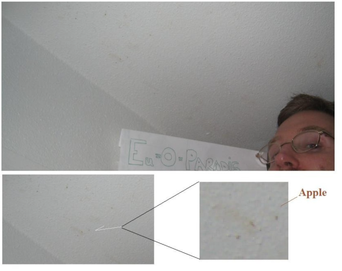After staring at formula for a long time, it was the middle of the night, I eventually fumbled into the kitchen and got an apple. I went from the kitchen back into the room with the red apple still in my hand. I might have taken a bite of it already, I dont remember. It was dead quiet in the middle of the night. I stood there in front of the bed with the red apple in my hand and just looked exhausted into the air, perhaps. I looked across the room at all the papers covered in scribbles that were strewn about the floor, and at the torn cardboard with the big letters on it. The room was now a chaos of papers and scribbles, as after an intellectual battlefield with the tornado. As I stood there looking over all the papers, I suddenly understood something. Presumably, it was at this point that the understanding of the formula began to reach the conscious part of the brain after having a short break from the work. My brain drew a quick summary of the whole situation surrounding the newborn formula and the consequences it could lead to. At the same time, the tornado had stopped. In pure ecstasy, I threw the apple in my hand as hard as I could into the wall as I cheered inside (I later took a picture of the apple stains before I moved out of the room a few years later — see under). I threw myself down on the bed and lay there, it was finally time to sleep. As I layed there I remember seing small pieces of apple strewn all over the room and apple juice running down the wall, but most of the apple seemed to be stuck to the walls and ceiling. Looking up from the bed I remember being surprised at how much of the apple was still stucked to the walls and ceiling. Tens of hours of intense focus on the link between biology’s role in the universe were now over. Finally, I could close my eyes and relax in bed, and I was not afraid anymore.